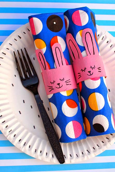 Add a whimsy to your table settings with bunny napkin rings made from toilet paper rolls. Cut the rolls into rounds, decorate them with paint or paper, and add bunny ears and a nose. The easy tutorial is here.