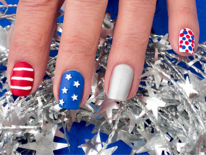 Feeling a little adventurous, maybe? Try the Star and Stripes, Dotted Silver Nails. This look is all about mixing silver and sparkles to get a base that seriously pops, then jazzing it up with fun red and blue stripes and dots. It's like the American flag got a glam makeover, and I'm totally vibing with it.