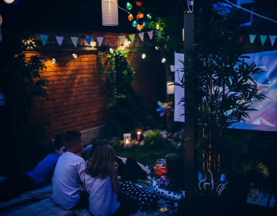 I adore organizing family movie evenings outside! Nothing is better than watching a movie with cushions, blankets, and tasty munchies while curled up under the stars. We often hang a sheet or use a portable screen to arrange our outdoor furniture in the backyard.