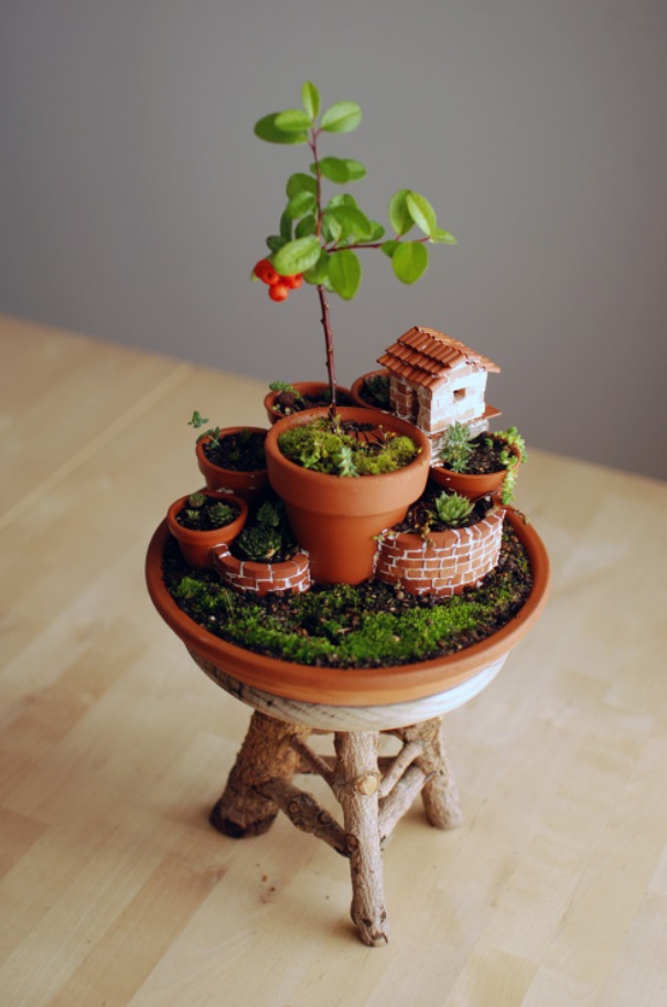You won't believe how charming this Flowerpot Mount with a Gardener's Hut with natural wood legs is. The combination of round pots with natural wood legs, small plant pots, and tiny plants creates a whimsical and enchanting scene, complete with a charming brick wall and an adorable house on top. Perfect for any indoor or outdoor space, bringing daily joy.