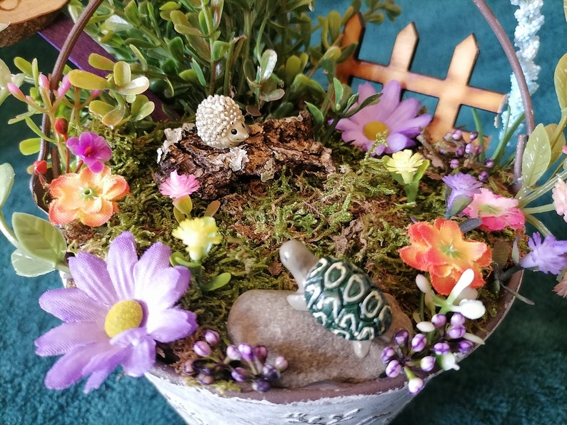 This mini garden in a metal pot with a fairy hedgehog and other charming accessories is absolutely adorable and clearly made with love. It adds a delightful touch to any room and makes a perfect flower arrangement and gift for anyone who loves fairy gardens or miniature gardening. I couldn't be happier with this precious little fairy garden.