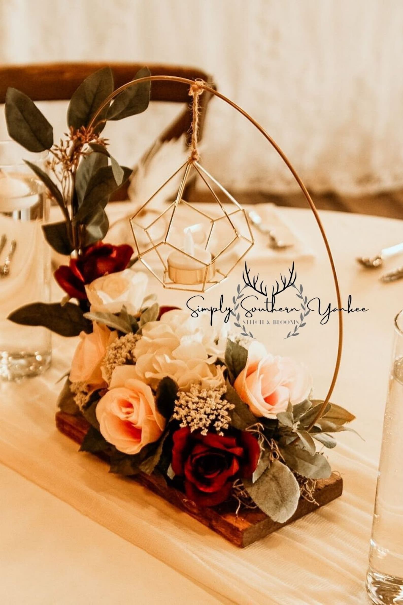 A floral hoop centerpiece can make any table look elegant. It's simple, chic, and you can easily customize it with your favorite flowers and colors.