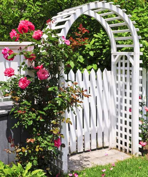 Gardens can have special door-like structures called arbors. When you build these with wood and put flowering trees and climbing plants around them, your garden's entrance looks wonderful.
