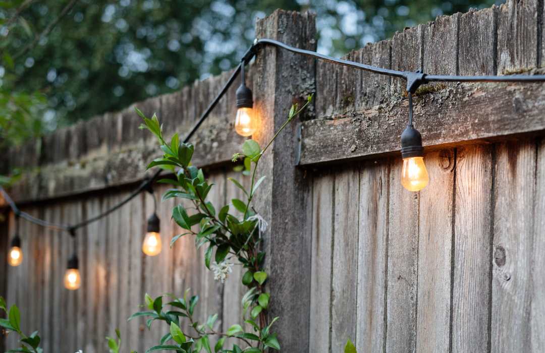 Adding strings of lights can change your backyard's look. With these lights and some lanterns, your garden looks warm and inviting at night.