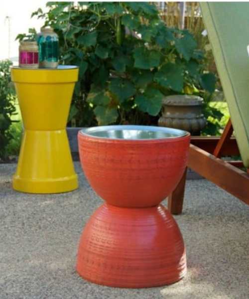 Two clay pots can be turned into a unique table. For the table top, some people use a metal circle from a pizza pan, but wood works too. Everything sticks together with special strong glue.