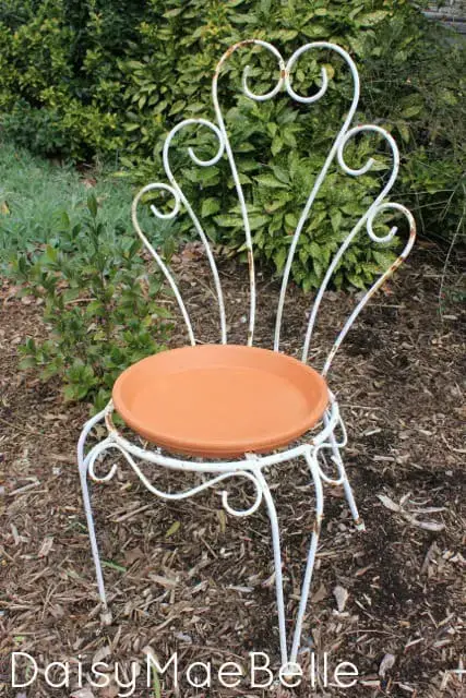 An unused chair? Transform it into a bird bath. Strong metal chairs work best. Just clean it, maybe paint, and place a clay pot filled with water on top. For the birds, pick a pot that's shallow. Your garden looks pretty and it's a nice spot for birds too. Or you can plant flowers in a bigger pot instead of water.