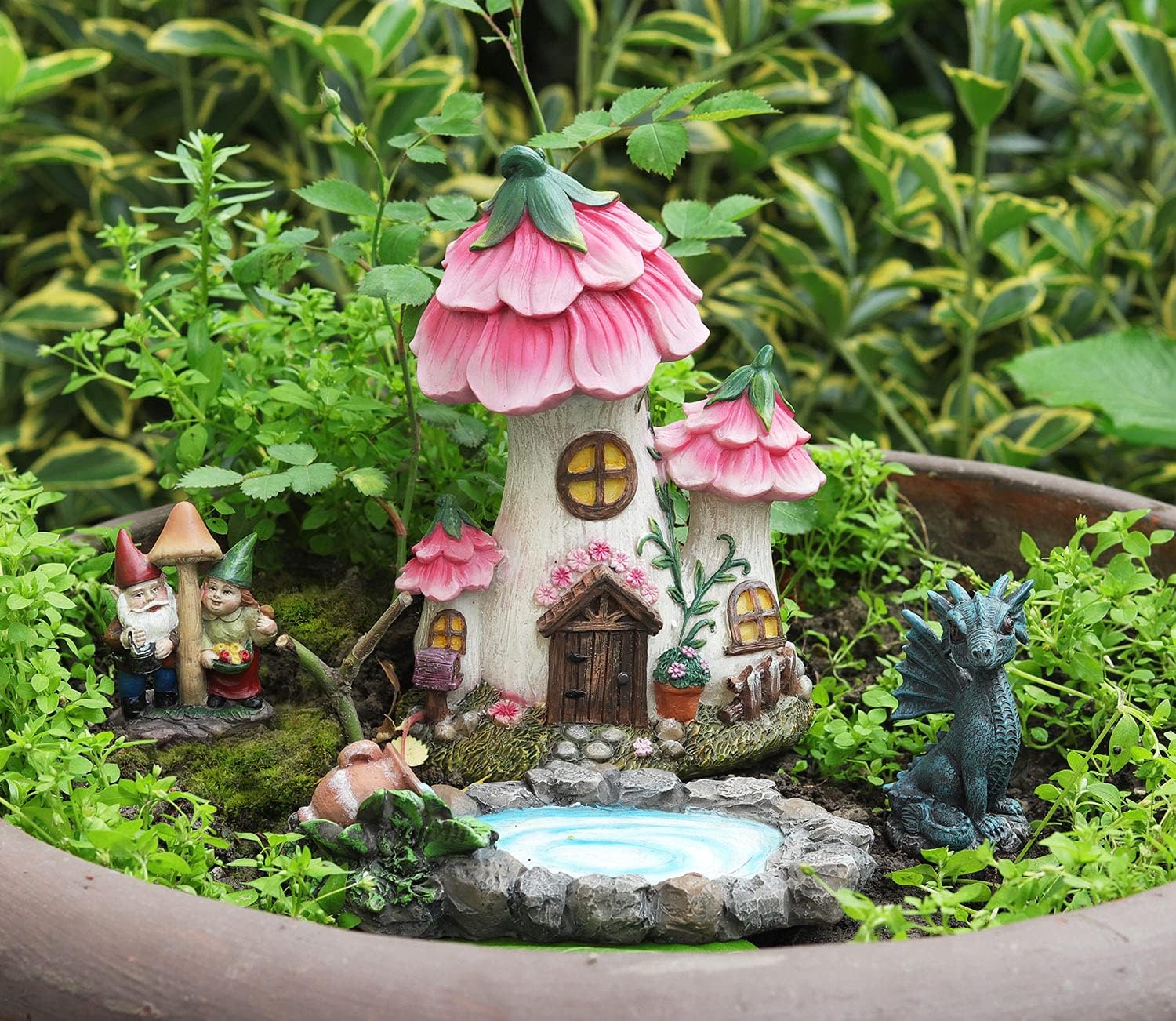 I have to say, this fairy garden is looking absolutely beautiful! Begin with a gorgeous fairy house, and then add a little pool, a gnome, and even a small dragon. With these extra additions, this fairy garden looks absolutely perfect! It's amazing how just a few small details can really bring a fairy garden to life and make it feel like a magical little world. I always smile whenever I see it.