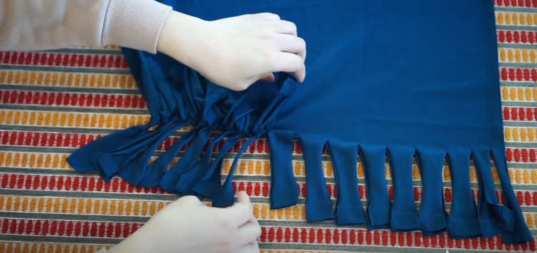 To secure the knots, continue tying the top strip to the bottom strip of the neighboring pair. Repeat this process for each strip. Your DIY no sew T-shirt tote bag is now complete and ready to use.