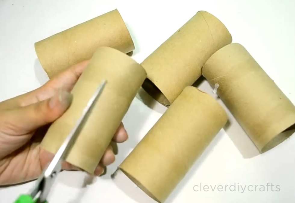 1. The first step, of course, is to cut the empty tissue rolls in half. For this project, we only need five empty tissue rolls.