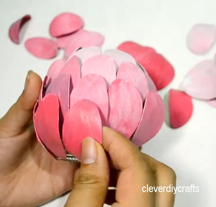 6. After painting, take the container you'll use for the candle holder and glue the painted petals onto it. Make sure to arrange them from the lightest to the darkest shade for a gradient effect. Your gradient candle holder is now complete. Enjoy!