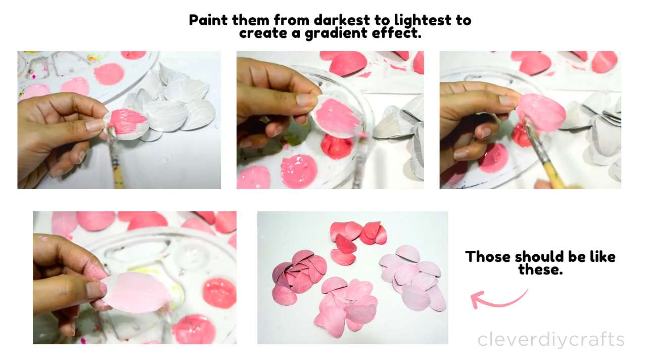5. Next, use the paint colors you've chosen. I used four colors ranging from dark pink to light pink. Mix a bit of pink and white paint for the lightest shade to achieve the desired color.