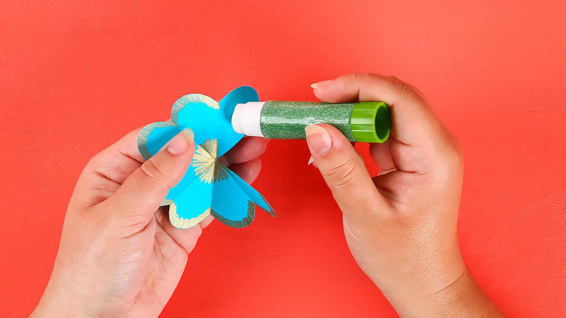 Step 4: Add the center. Put glue on the back of your paper circle and place it in the center of the flower. Press down to stick it in place.