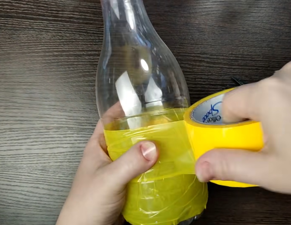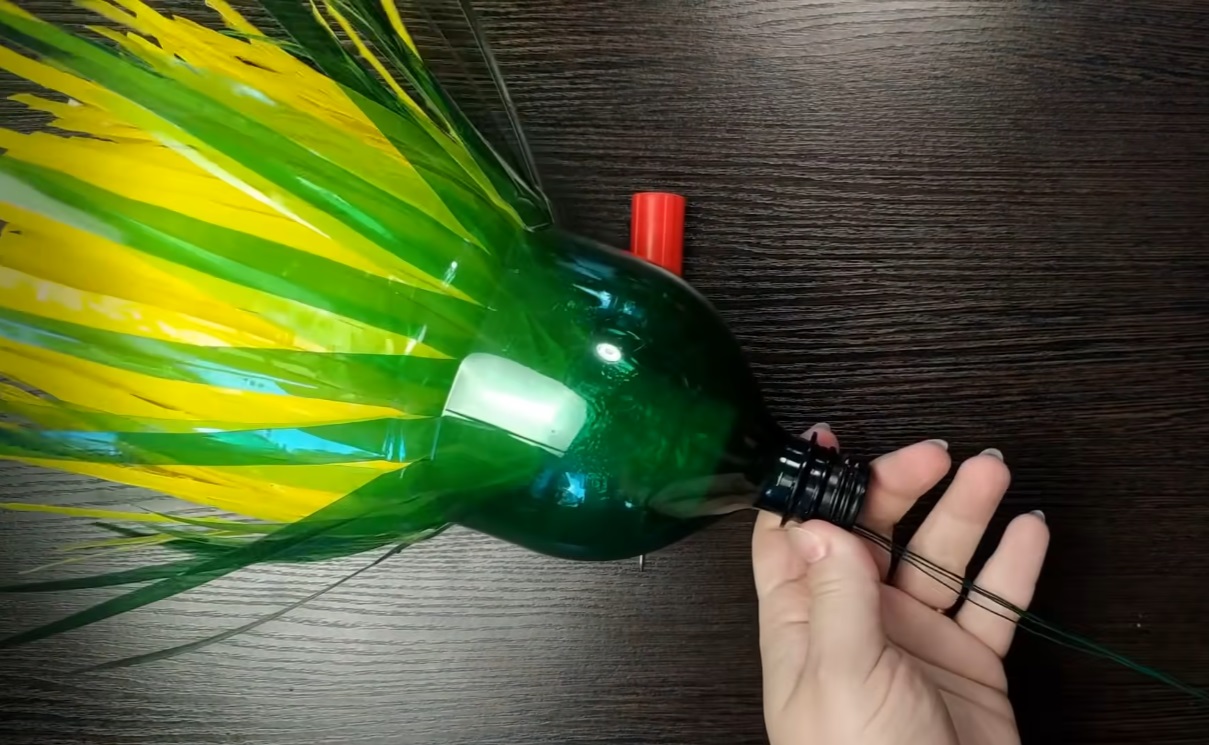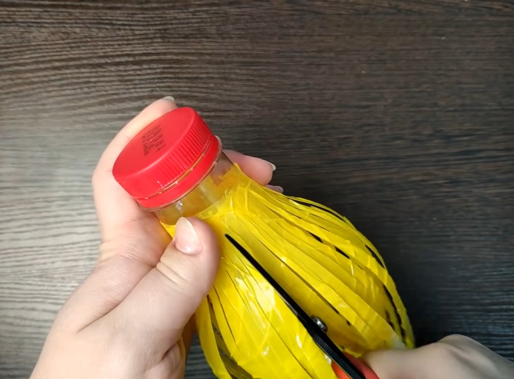 1. Prepare transparent plastic bottles by cutting them into strips, leaving the central part intact. Paint them yellow or cover them with yellow tape.