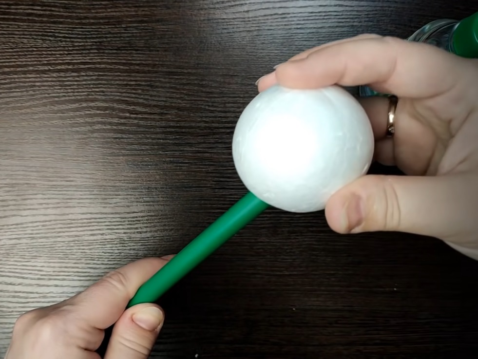 1. Prepare a foam ball and stem. Cut a hole in the foam ball for the stem and secure it with adhesive. Paint both green if needed.
