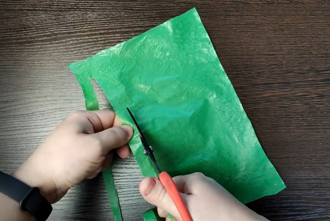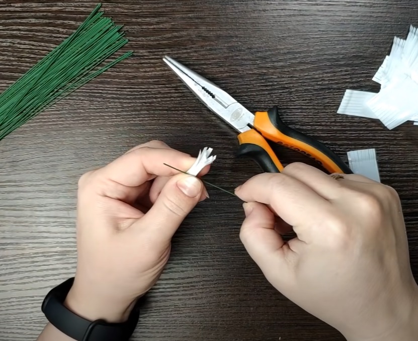 4. To create a fluffy appearance, twist each plastic rectangle into a tube, secure it with a wire, and bend the fringes outward.