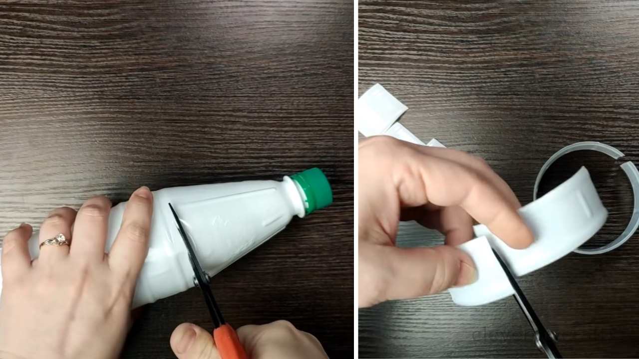 3. Cut the white plastic bottle into rectangles, leaving the central part intact. Cut fringes along both sides, leaving a few millimeters uncut at the center. Prepare wires for each rectangle.