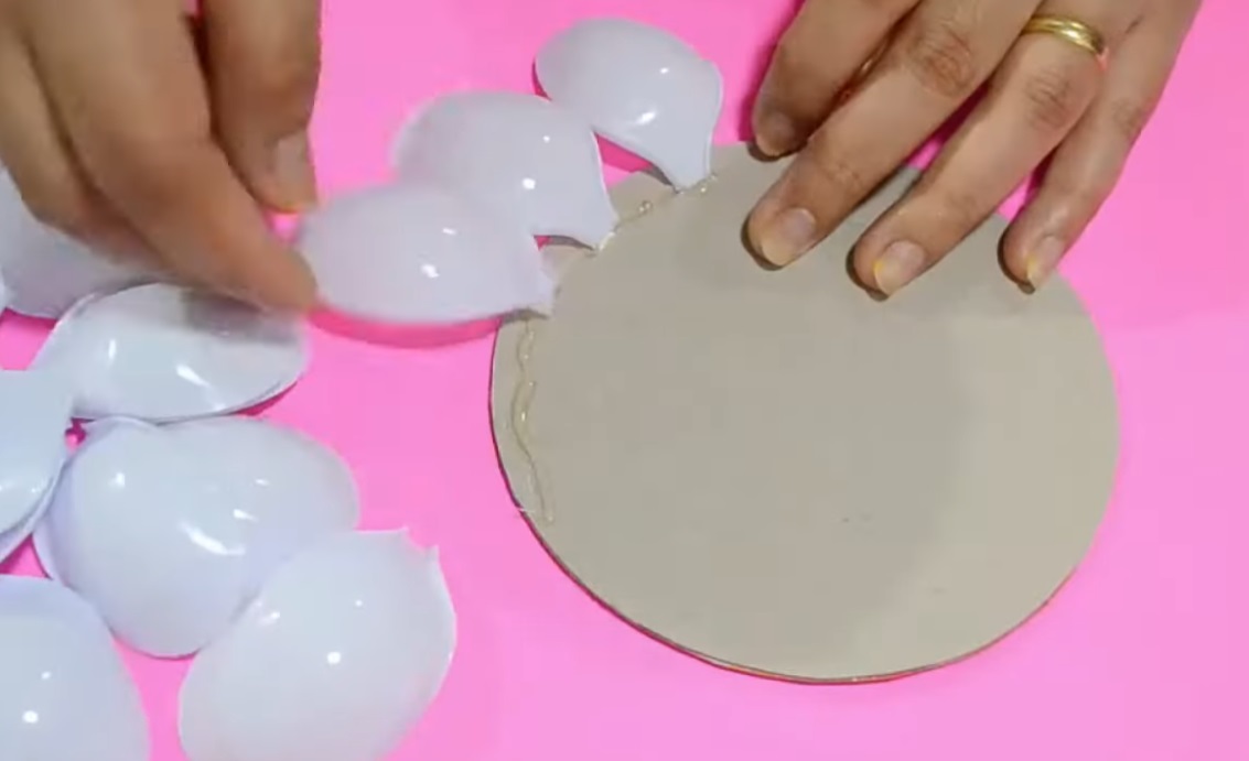 Using the cardboard circles you cut (it's up to you to decide the diameter based on the number of spoon bowls you prepared), stick them upside down one by one. Do this process twice. Then, glue the remaining spoon bowls that are standing up this time. Repeat this process twice as well.