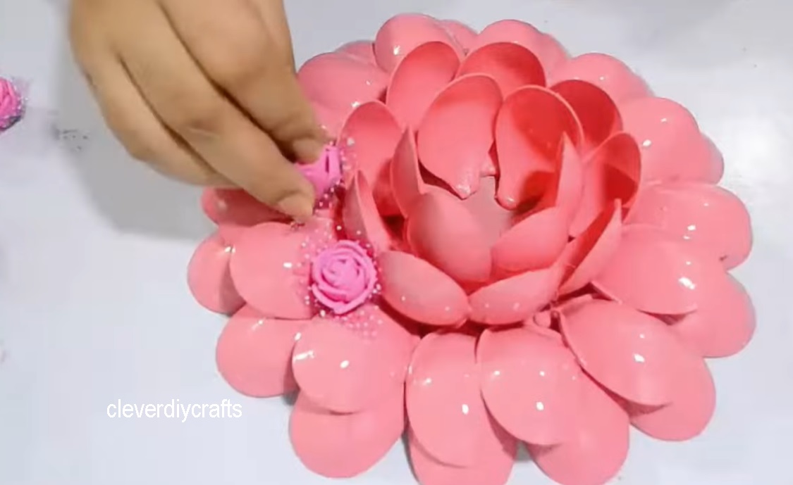 After that, spray it with any color that you want. The one I sprayed was dark pink. Then, glue the mini foam roses for decorations between the spoon bowls. And that's it. You have finished how to recycle plastic spoons into a nice, beautiful candle holder.