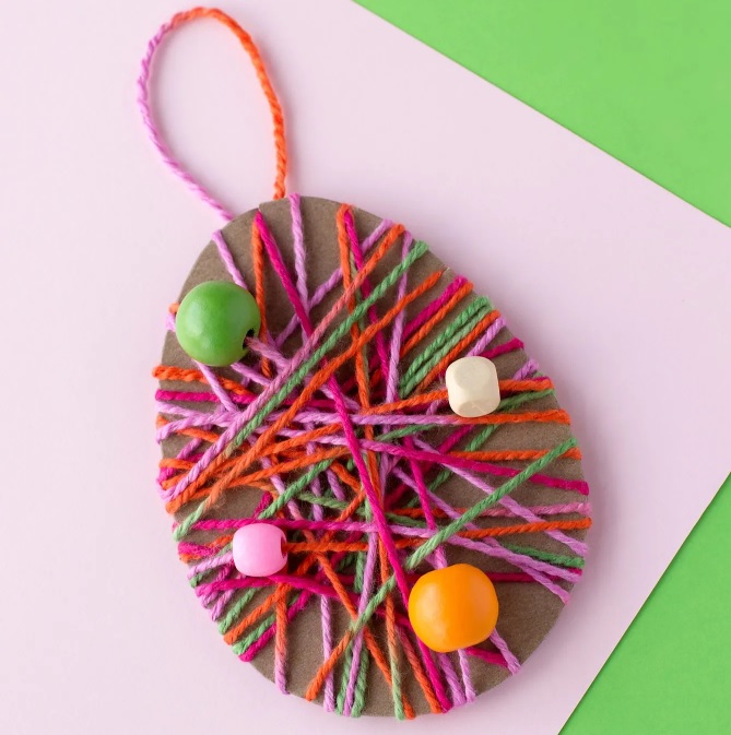 Colorful yarn can be wrapped around cardboard egg cutouts to create a soft, textured design. This craft is great for younger kids since the wrapping motion helps develop fine motor skills. The finished eggs make adorable decorations for an Easter tree or festive garland.
