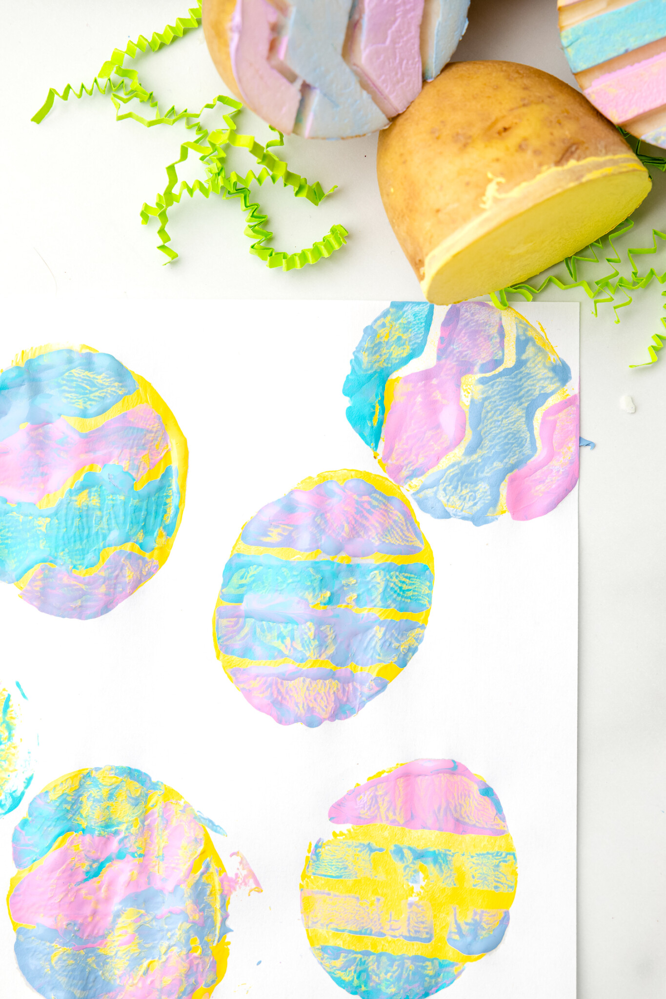 A potato can be turned into a creative stamping tool by carving simple egg designs. When dipped in paint and pressed onto paper, it creates playful Easter-themed prints that even toddlers can enjoy.