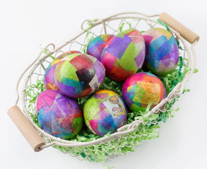 Layering torn tissue paper onto egg cutouts creates a stained-glass effect with beautiful colors. This simple craft is a great way to explore color blending and textures.